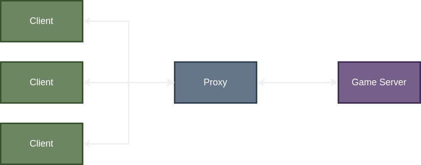 | Figure 1: A simple example of multiple clients connecting to a Game Server via a Proxy |